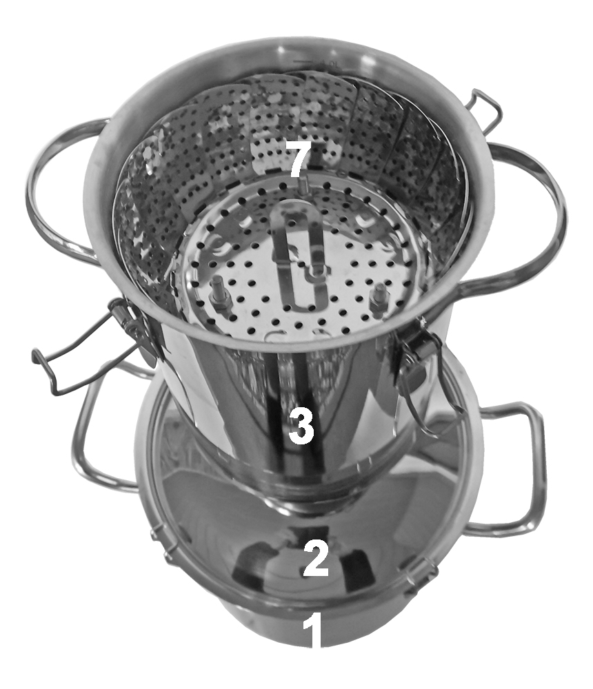 - 4 Liter Pflanzenrohr aufsetzen und den Kessel mit den Spannverschlüssen 1.1 verschließen.