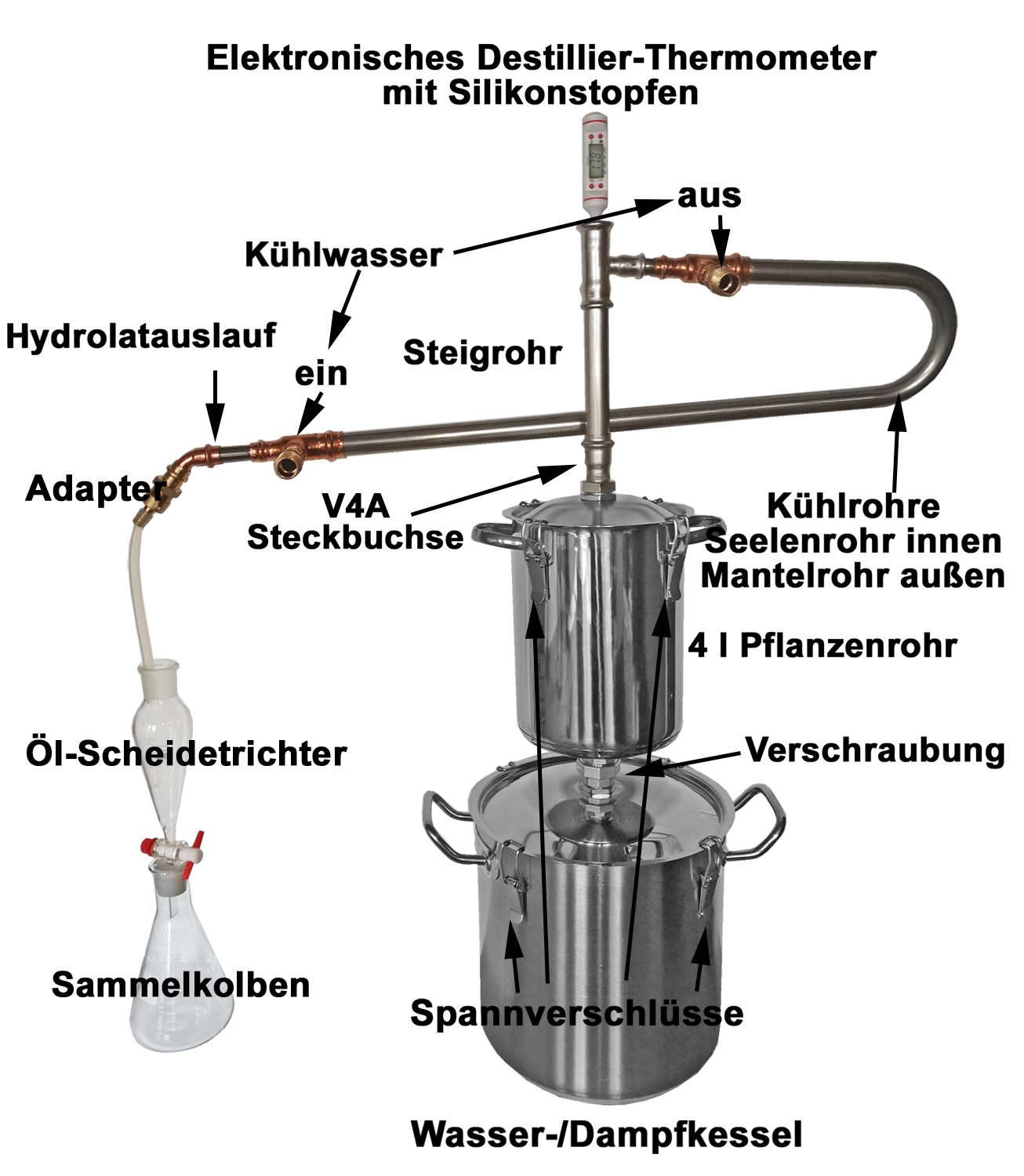 Legale, anmeldefreie Destille aus Edelstahl für Ätherische Öle und mit satten 4 Litern Pflanzenraum.