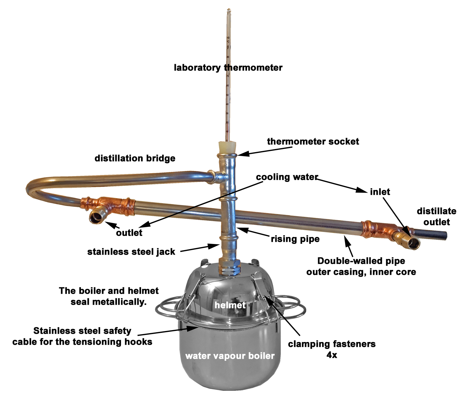 The distillation pot and all pipes carrying distillate are made of stainless steel.