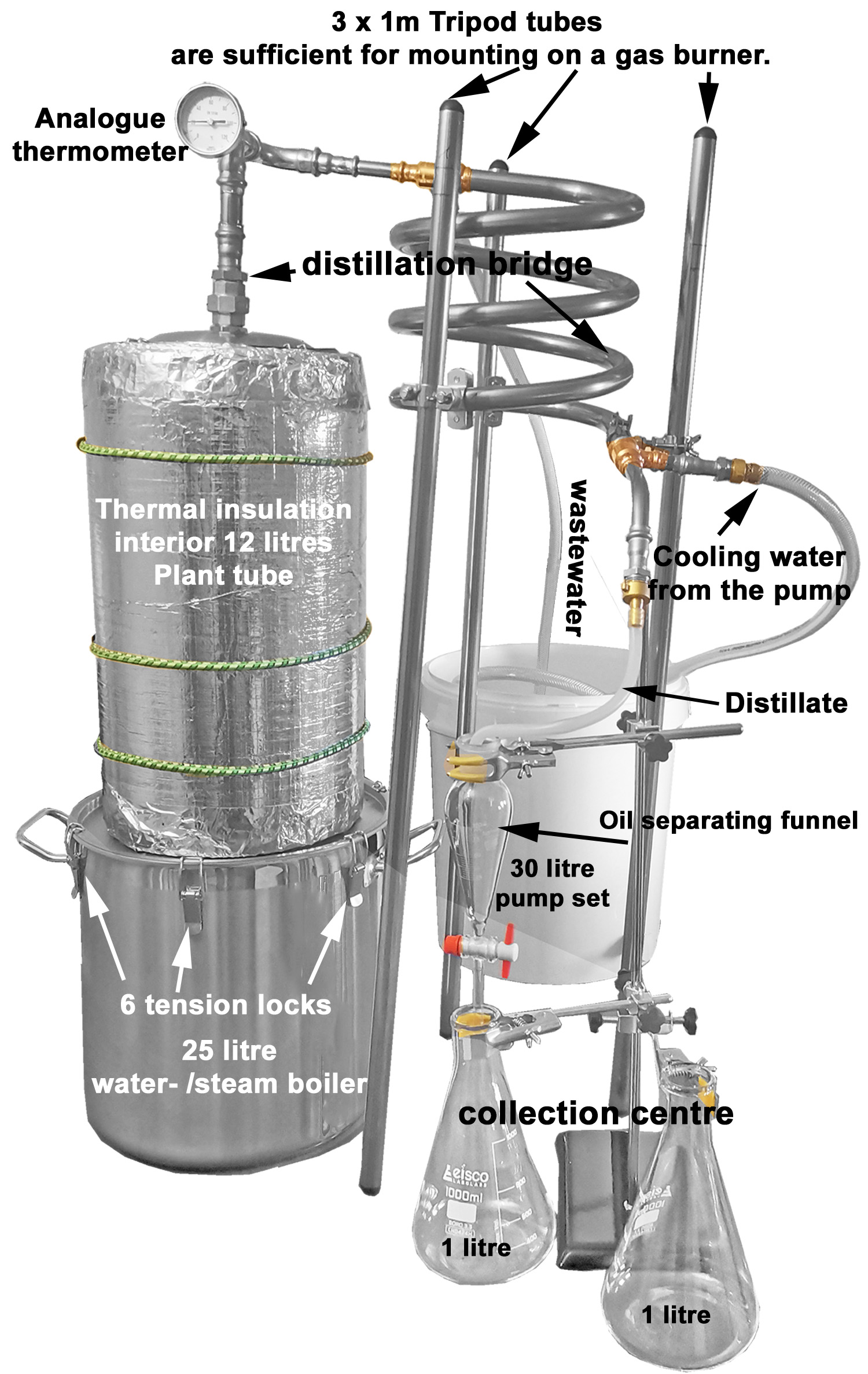 For the distillation of essential oils with 25-liter water/steam boiler for multiple distillation runs