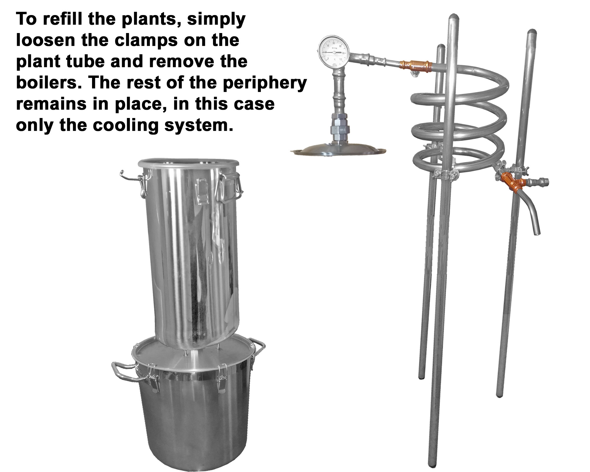 With the appropriate permit – e.g., if you are working commercially – this system is also ideal for alcohol distillation. In these cases, the plant tube serves either as a column for mash distillation or as a container for fruits or herbs in alcohol vapor distillation.